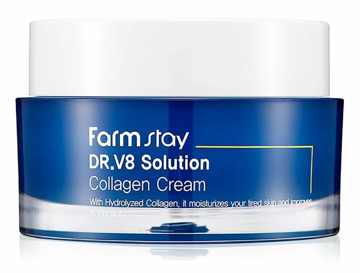 FarmStay DR-V8 Solution Collagen Крем для лица антивозрастной, 50 мл - идеальное средство для каждодневной бьюти-рутины в борьбе за идеальную кожу лица. Продукт богат питательными натуральными ингредиентами, которые оказывают омолаживающее действие, регенерируют кожу, восстанавливают, устраняют мелкие морщинки. Коллаген делает кожу упругой, проникает в глубокие слои дермы, омолаживает и подтягивает. Ниацинамид поддерживает водный баланс в клетках кожи, участвует в синтезе природного коллагена. После использования данного крема кожа станет напитанной, подтянутой, гладкой и бархатной на ощупь.