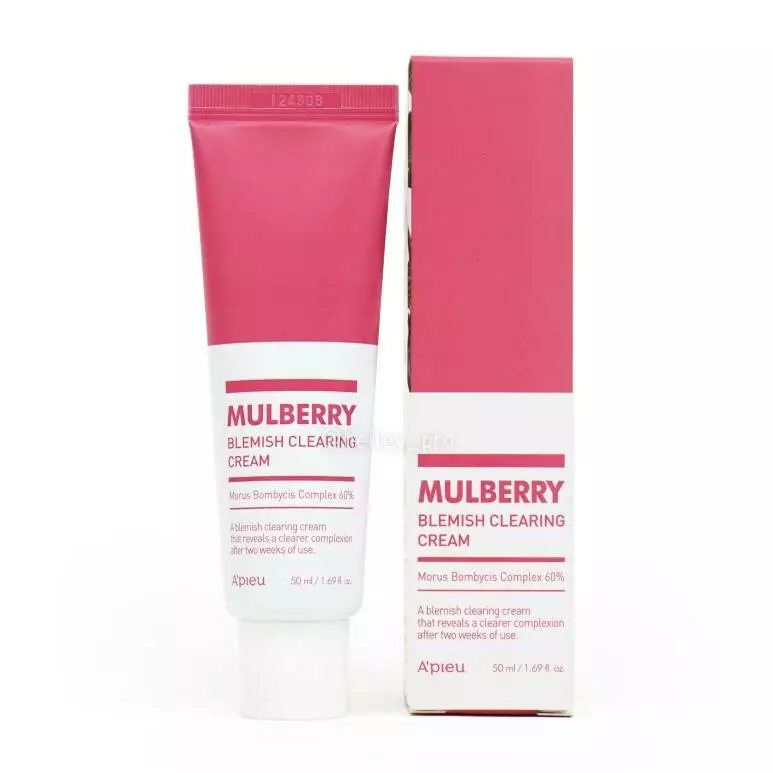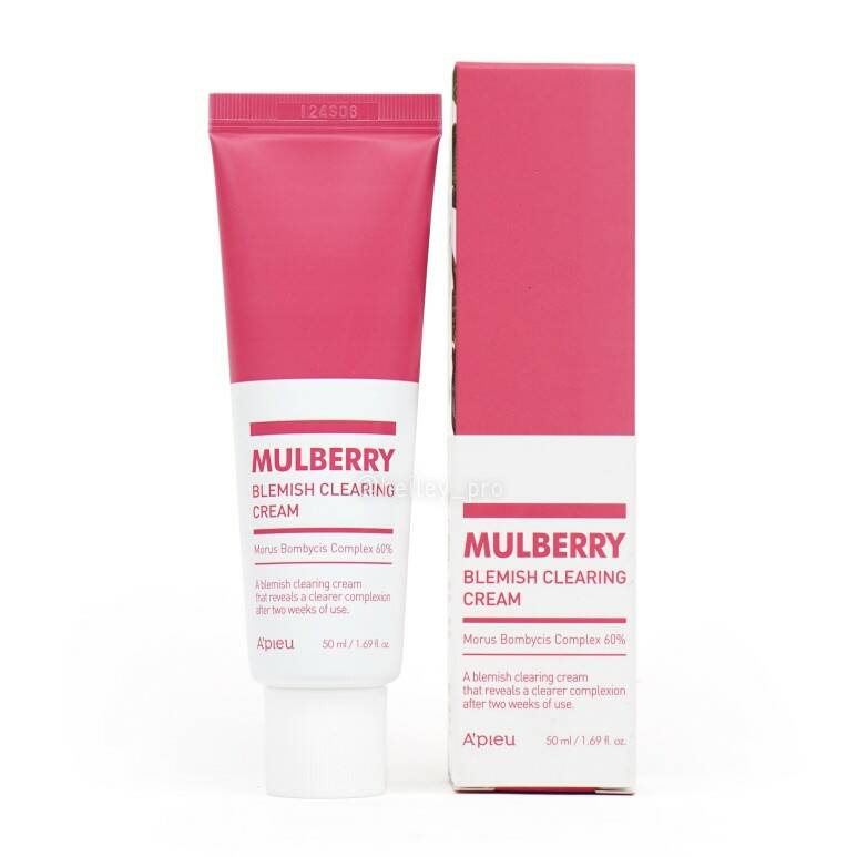 A'pieu Mulberry Blemish Clearing Cream - крем для проблемной кожи лица, который очищает дерму от гиперпигментации. Продукт также отлично справится с отбеливанием веснушек и других пятен.