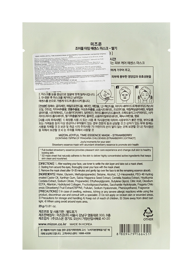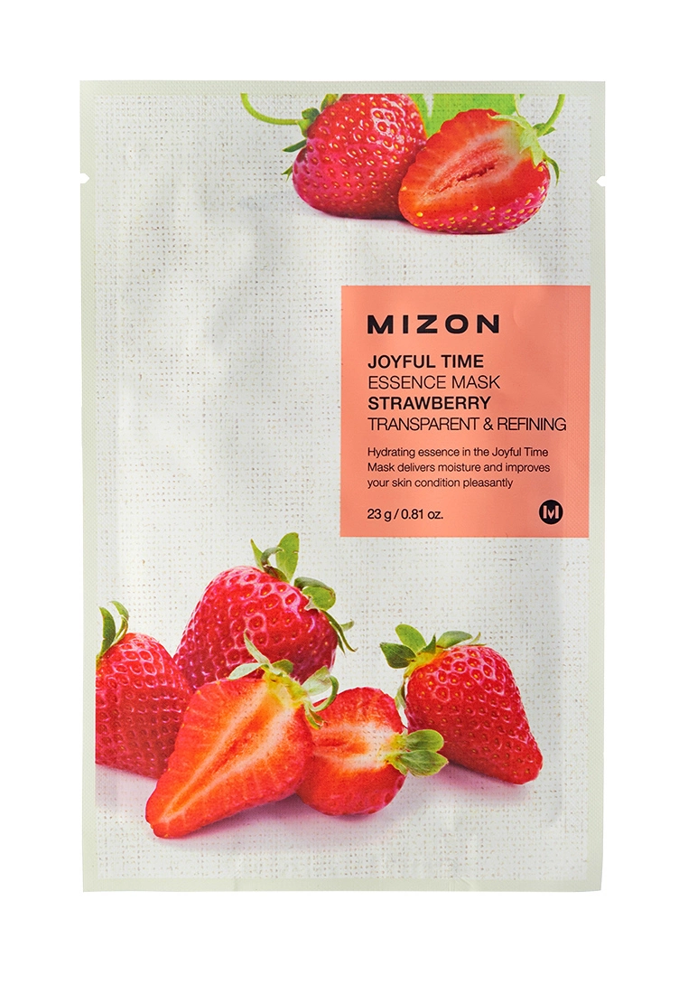 Mizon Joyful Time Essence Mask Strawberry — это листовая маска для лица с экстрактом земляники. Она смягчает, питает и увлажняет кожу, устраняет болезнетворные проявления, снимает чувство усталости и замедляет проявление возрастных изменений.