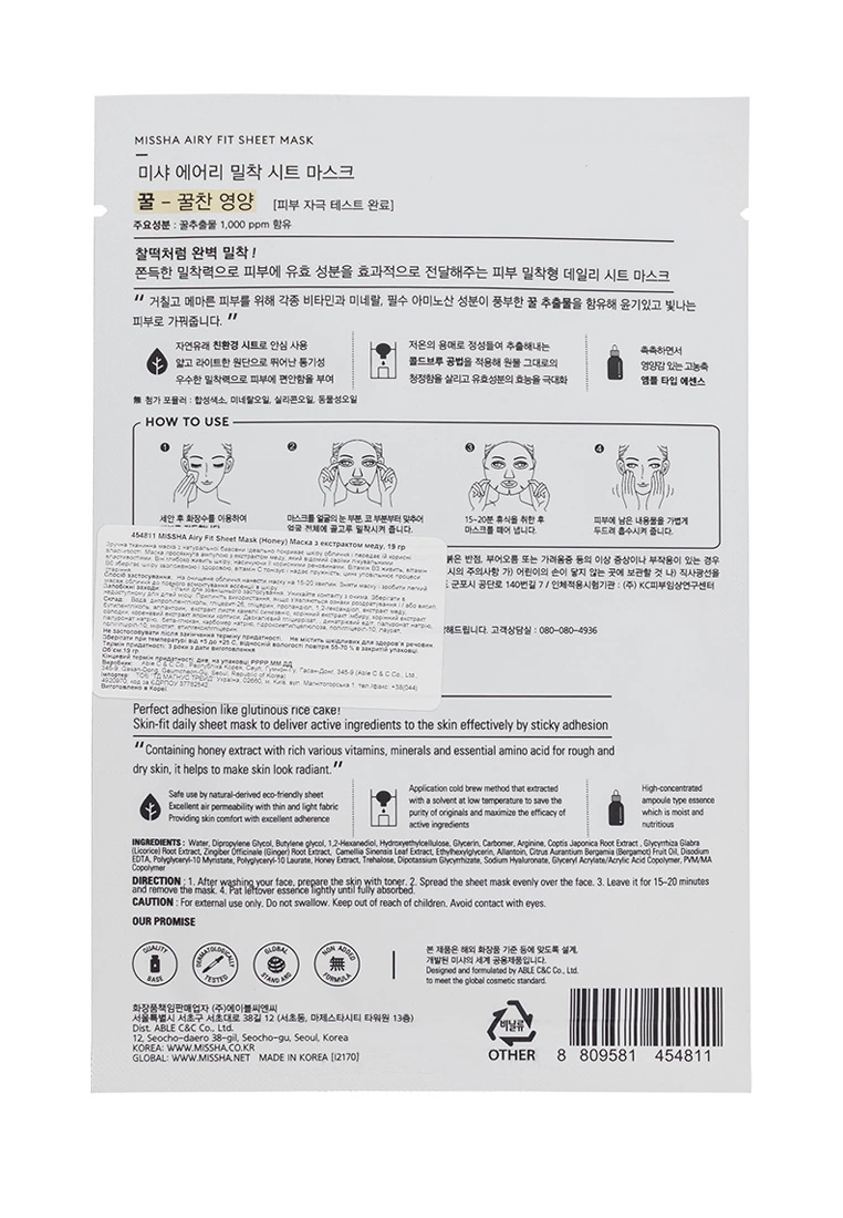 Маска для лица Мед Missha Airy Fit Honey 19 г (8809581454811)