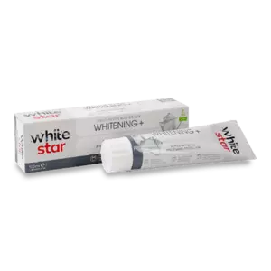 White Star Whitening+ – зубная паста с уникальной формулой для бережного и безопасного отбеливания. Эта паста эффективно удаляет зубной налет, полирует поверхность эмали и предотвращает образование новых пятен. Whitening+ возвращает зубам белье, не повреждая эмаль и не повышая чувствительность зубов.