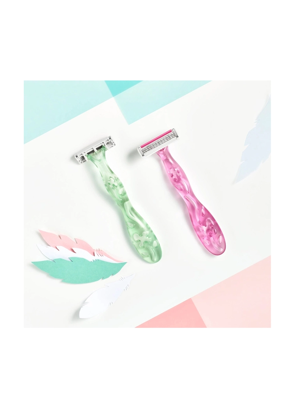 Женская бритва BIC Miss Soleil Sensitive – идеальный выбор для женщин, которые выбирают гладкое бритьё с меньшим раздражением. У бритвы 3 независимо подвешенных лезвия и плавающая головка, которая повторяет контуры тела для нежного и чистого бритья. Её увлажняющая полоска с алое вера и витамином Е обеспечивает отличную гладкость ног, подмышек и зоны бикини. Её удобную эргономичную ручку удобно держать в руке, а для ещё более приятного бритья ручка украшена цветочными рисунками и представлена в двух цветах в упаковке (розовый и салатовый).