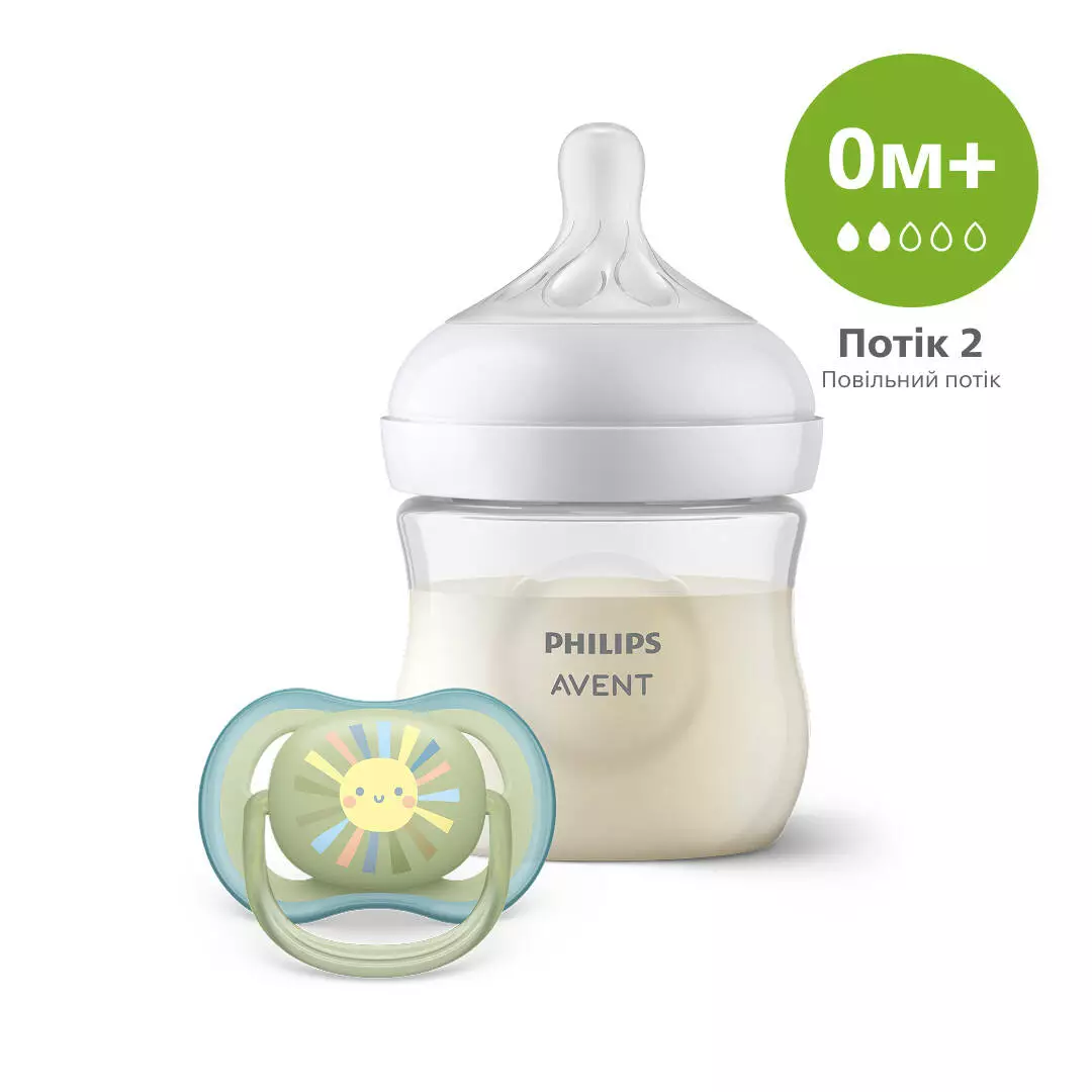 Набор для новорожденных, содержащий бутылку Natural природный поток 125 мл и пустышку, это идеальный выбор для начала кормления и успокоения малыша.