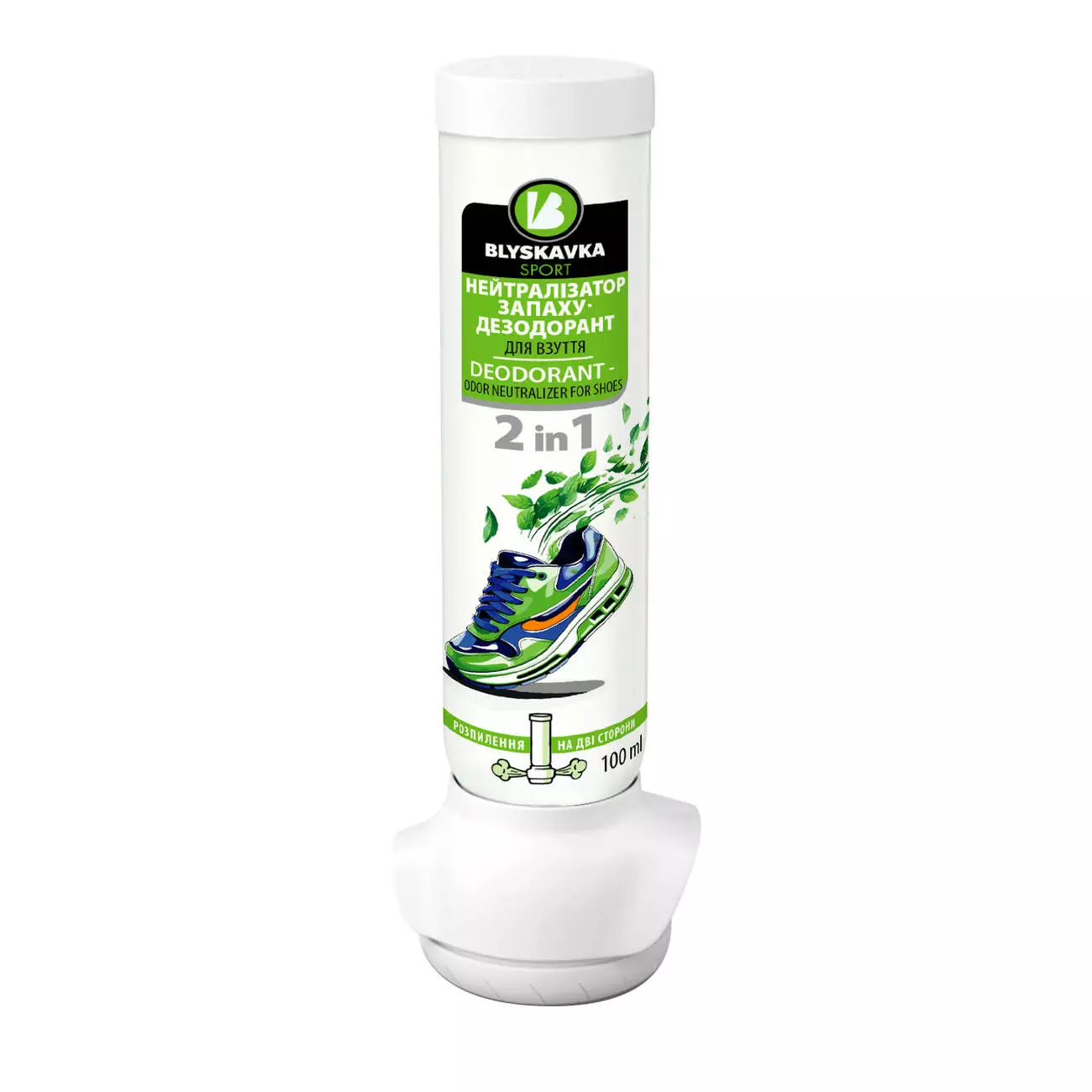 2 in 1 Нейтрализатор запаха – дезодорант для обуви ТМ «Blyskavka Sport». Подходит для всех видов спортивной обуви, включая кожу, замшу и текстиль. Быстро сохнет, не оставляя следов на обуви или ногах.