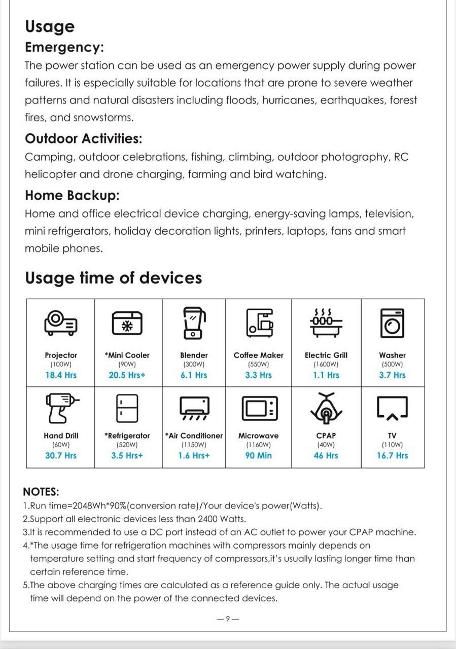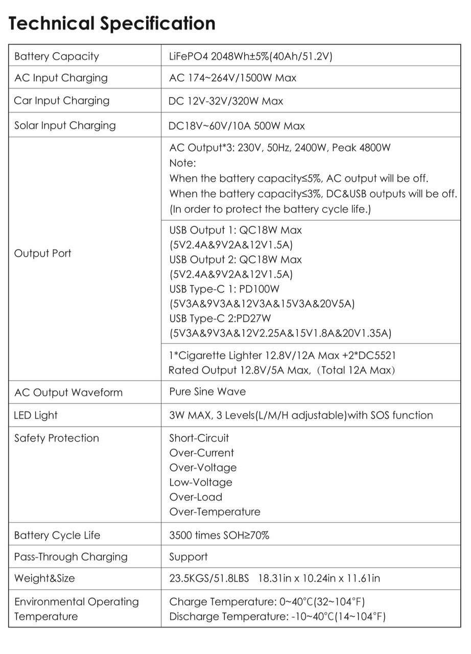 Battery Capacity: LiFePO4 2048Wh+/-5%(40Ah/51.2) AC Input Charging: AC 174-264V/1500W Max Car Input Charging: DC12V-32V/320W Max Solar Input Charging: DC 18V-60V/10A 500W Max Ouyput Part: USB Ouyput1^QC 18W Max(5V2.4A&9V2A&12V1.5A), USB Output 2: QC18W Max(5V2.4A&9V2A&12V1.5A)USB Type-C 1: PD 100W(5V3A&9V3A&12V3A&15V3A&20V5A) USB Type-C 2:5V3A&9V3A&12V2.25A&15V1.8A&20V1.35A) 1*Cigarette Lighter 12.8V/5A Max(Total 12A Max), Led Light, Battery Cycle life:3500 times SOH>=70%, Weight&Size 23.5KGS/51.8LBS, 18.31in/10.24in/11.61in, Environmental Operating Temperature: Charge Temperature: 0-40*C, Discharge Temperature 10-40*C |