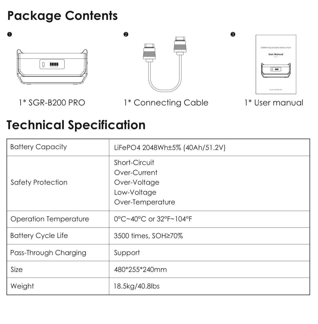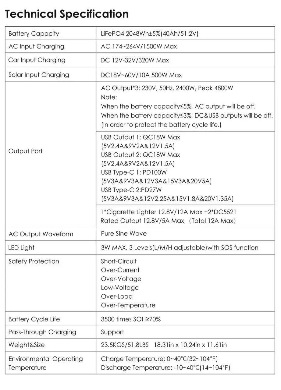 | Battery Capacity: LiFePO4 2048Wh+/-5%(40Ah/51.2) AC Input Charging: AC 174-264V/1500W Max Car Input Charging: DC12V-32V/320W Max Solar Input Charging: DC 18V-60V/10A 500W Max Ouyput Part: USB Ouyput1^QC 18W Max(5V2.4A&9V2A&12V1.5A), USB Output 2: QC18W Max(5V2.4A&9V2A&12V1.5A)USB Type-C 1: PD 100W(5V3A&9V3A&12V3A&15V3A&20V5A) USB Type-C 2:5V3A&9V3A&12V2.25A&15V1.8A&20V1.35A) 1*Cigarette Lighter 12.8V/5A Max(Total 12A Max), Led Light, Battery Cycle life:3500 times SOH>=70%, Weight&Size 23.5KGS/51.8LBS, 18.31in/10.24in/11.61in, Environmental Operating Temperature: Charge Temperature: 0-40*C, Discharge Temperature 10-40*C |