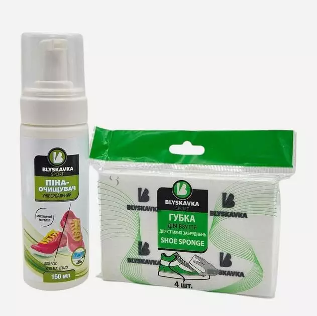Эффективное средство удаления грязи и пятен с поверхности обуви и одежды. Безопасно очищает изделия из гладкой кожи, нубука, замши и ткани. Cleaner пена-очиститель быстро и легко очищает от загрязнений поверхность, не изменяя ее цвет и свойства. Обладает приятным запахом, безвредным для окружающей среды. Удобный дозатор на флаконе позволяет быстро наносить средство. Губка молниеносная для обуви ТМ BLYSKAVKA предназначена для удаления устойчивых загрязнений на белой или светлой подошве. Рекомендовано использовать для чистки белой или светлой подошвы кроссовок, кед, сандалий, а также для белой обуви из эко кожи, резины, синтетических материалов и т.д. Также можно использовать для чистки пластиковых, деревянных, стеклянных, керамических, резиновых, эмалированных и металлических поверхностей. Экономическое средство – одного флакона хватает на отделку 20 пар обуви.