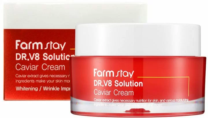 FarmStay DR-V8 Solution Caviar Питательный крем для лица с экстрактом икры, 50 мл – идеальное средство для каждодневной бьюти-рутины в борьбе за идеальную кожу лица. Продукт богат питательными натуральными ингредиентами, которые оказывают омолаживающее действие, регенерируют кожу, восстанавливают, устраняют мелкие морщинки. Основной компонент - экстракт икры, он питает кожу полезными микроэлементами, значительно замедляет процессы старения на клеточном уровне. Гиалуроновая кислота сохраняет и длительно удерживает естественную влагу кожи. После использования данного крема кожа станет напитанной, подтянутой, гладкой и бархатной на ощупь.