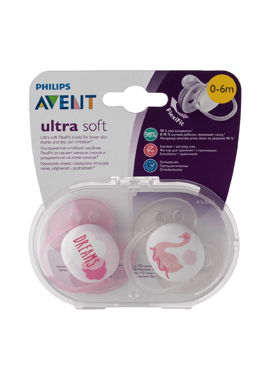 Силиконовая пустышка philips avent ultra soft 0-6 мес. для девочек 2шт. (scf222/02) (8710103938743)