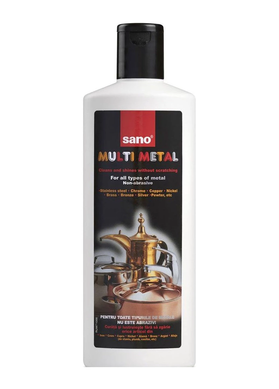 Sano Multi Metal — высокоэффективная кремообразная жидкость для чистки всех типов металлических изделий без царапин. Очищает и полирует всю металлическую посуду из нержавеющей стали, хрома, никеля, латуни, меди, бронзы и т.д. Подходит для чистки и полировки металлических раковин, смесителей, кастрюлей и сковородок, чайников, подносов и т.д.