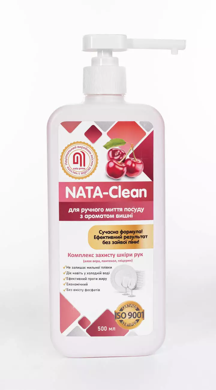 | Средство моющее «NATA-Clean для ручной мойки посуды» с ароматом вишні-гелеобразное, готовое к использованию средство с запахом лимона, желтого цвета, эффективно удаляет жир и создает умеренную пену. Экономичен в использовании, легко ополаскивается и смывается водой, не оставляет мыльной пленки. Разработанный комплекс защиты кожи с натуральными ингредиентами предотвращает сухость кожи рук. Средство эффективно действует как в горячей, так и в холодной воде. |