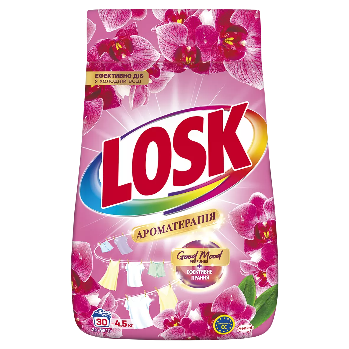 Losk Ароматерапия Аромат Малазийского цветка дополнит Вашу повседневную жизнь привлекательным ароматом цветов и придаст долговременную свежесть Вашим вещам. Благодаря мощной формуле Losk эффективно удаляет сложные пятна при температуре от 20° и позволяет сделать большое количество грязного белья блестяще чистым и свежим, стирая даже при низкой температуре.