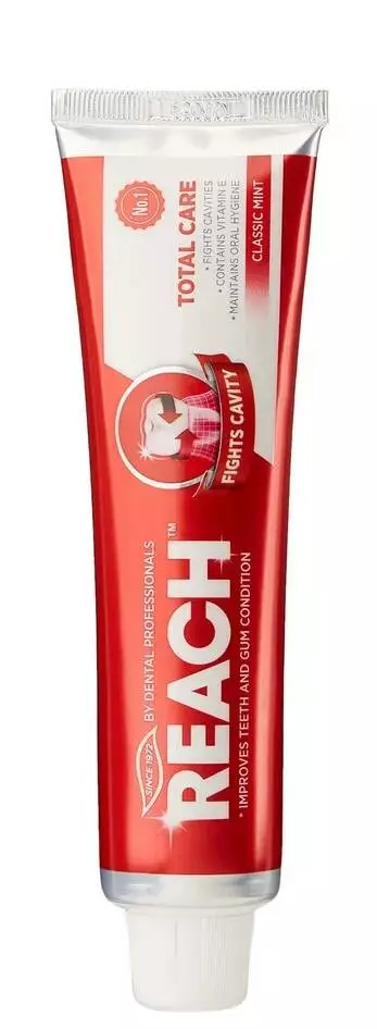 Зубная паста Reach Total Care Классическая мята поддерживает гигиену полости рта и освежает дыхание на 12 часов. Также улучшает состояние зубов и десен и борется с кариесом.