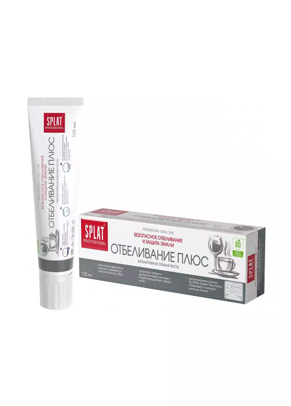 Любители чая, кофе, сигарет или вина не понаслышке знают, что все эти продукты оставляют видимый след на поверхности зубов. Чтобы избавиться от этих внешних проявлений, сделать свою улыбку белоснежной, а дыхание свежим, воспользуйтесь специальной пастой от Splat Professional White plus. Она обогащена множеством активных компонентов, которые в сочетании с натуральными природными экстрактами эффективно устраняют все загрязнения, а также заботятся о здоровье зубов и десен.