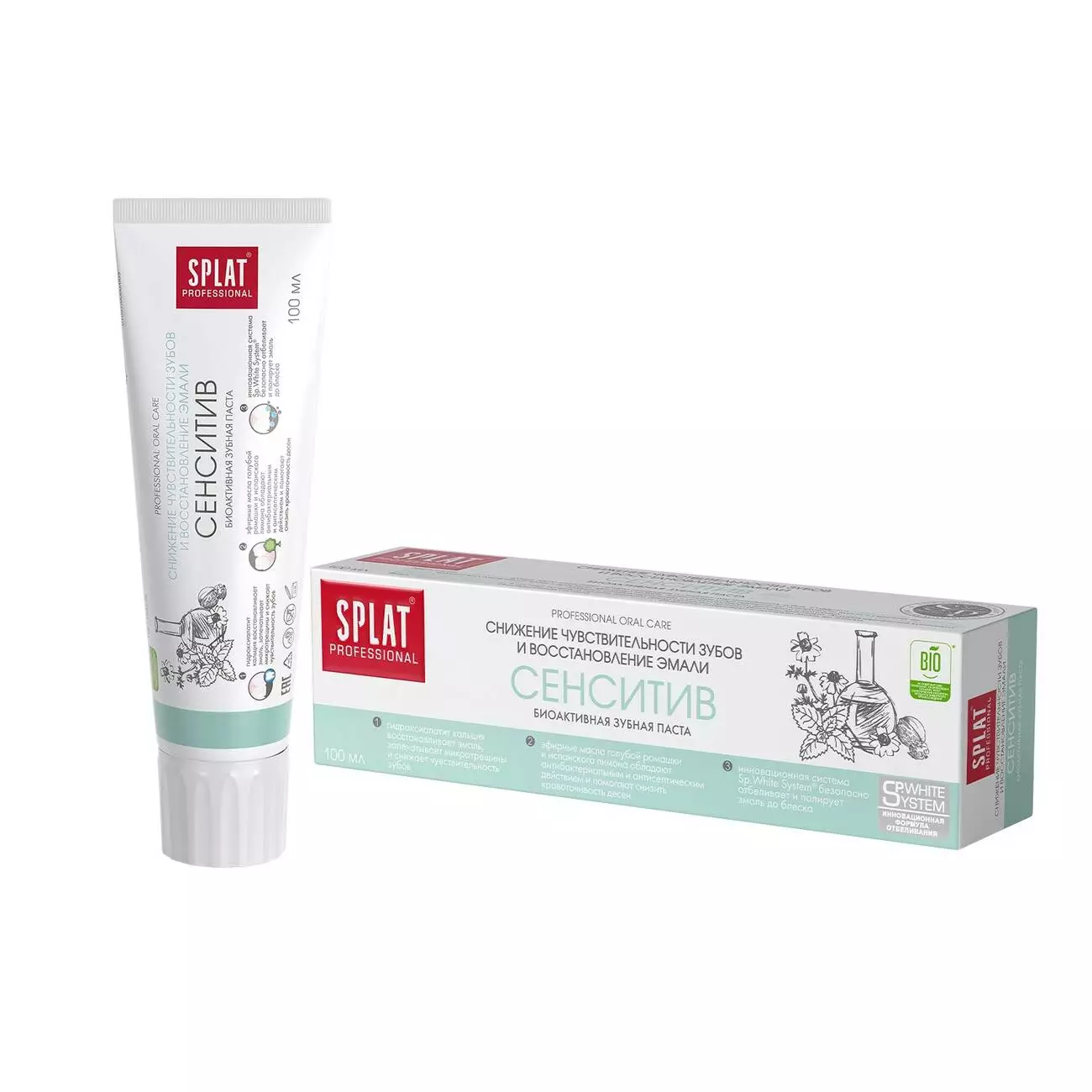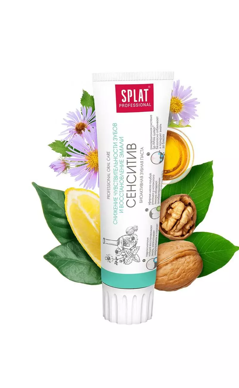 Эффективная зубная паста Сенситив Splat оказывает всестороннее воздействие : освежает и очищает полость рта, восполняет потерю важных минералов, снижает повышенную чувствительность зубов благодаря уникальному составу. Одним из ингредиентов является вещество гидроксиапатит – основной строительный компонент эмали, который заполняет и запечатывает микротрещинки на поверхности эмали.