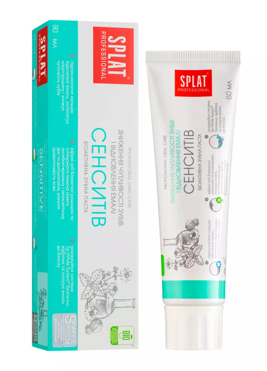 Эффективная зубная паста Сенситив Splat оказывает всестороннее воздействие : освежает и очищает полость рта, восполняет потерю важных минералов, снижает повышенную чувствительность зубов благодаря уникальному составу. Одним из ингредиентов является вещество гидроксиапатит – основной строительный компонент эмали, который заполняет и запечатывает микротрещинки на поверхности эмали.
